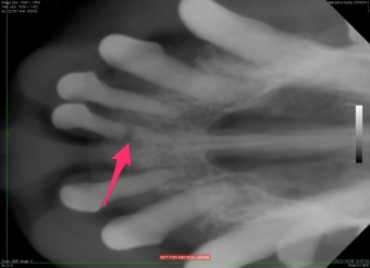この写真の矢印のところ・・・分かりますよね?歯が折れています。でもこれは歯肉のなかで外からは見えない部分の事なので、こんな事が起きているなんて、レントゲン撮影なしではわかりません。でも歯が折れていることで痛みを感じています。