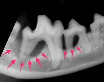 たとえばこの写真わんこは、外見は歯石以外には大きな異常はありませんでした。しかしレントゲンを撮影すると、この写真の矢印の部分が重度の歯周病であごの骨が溶けていることがわかります。このまま歯石を取るだけではなんの解決にもならず、場合によってはもっと骨が溶けて顎の骨が骨折ということも起こりえます。ここまで骨が吸収された歯は抜歯が必要になります。確かに抜歯は可哀想かもしれませんが、もし抜歯をせずに置いておけば、動物の不快感は取れず、将来もっと大変な問題を起こしてしまします。