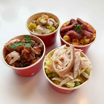 1) 鹿肉のローストとマカロニチーズ 2) 豚肉のポトフ 3) ターキーとサフランライス 4)チキチキと発酵野菜サラダ