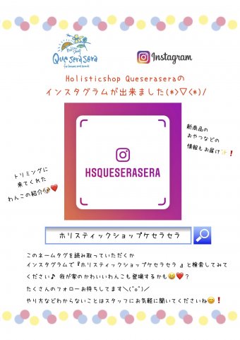 先日、予告をしていました『Instagram インスタグラム』を始めました(*˘︶˘*) トリミングに来て下さったわんちゃんやわんこごはん、商品などなど… リアルタイムで色々な情報も発信しようと思います✧٩(ˊωˋ*)و✧ ぜひ、フォローをしてみて下さいね॰˳ཻ̊♡ わからない事がありましたら遠慮なく聞いて下さいね☃︎.*·̩͙