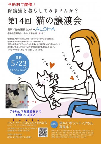 来月の譲渡会の予定は5/23(日)13時から16時までの予約制で開催予定です。