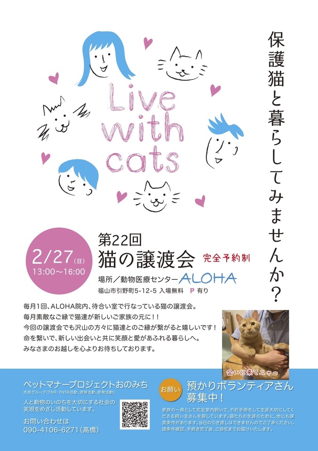 前回も告知をしていましたが、今月27日(日)13時からは保護猫達の譲渡会があります! まだ予約に空きがあります! 本当に可愛い子達なんですよ♡ ぜひ、ご予約いただき会いに来てくださいね!! ペットマナープロジェクトおのみちさんが色々と相談にものって下さいます。 感染対策にもご協力をお願い致します。
