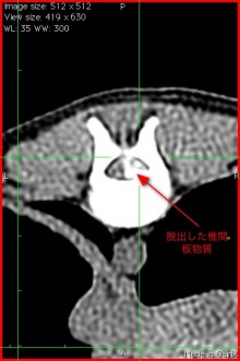 CTの検査をおこなってみるとT(胸椎)の11番と12番の間と12番と13番の間に椎間板ヘルニアが観察され、とくに12番と13番の間ではかなりひどい椎間板物質の脱出が見られました。写真で白く写っているのが飛び出した椎間板物質です。手術はうまくいきましたので、歩けるようになってくれると思います。