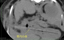 串はCTで写ったとおり、胃から数センチ飛び出していました。幸い肝臓や脾臓に刺さってはいませんでしたので、大事にならずにすみました。