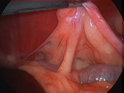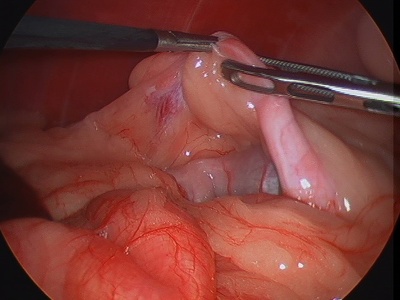 子宮を少し上に上げて、卵巣の血管がよく見えるようにポジショニングしています。