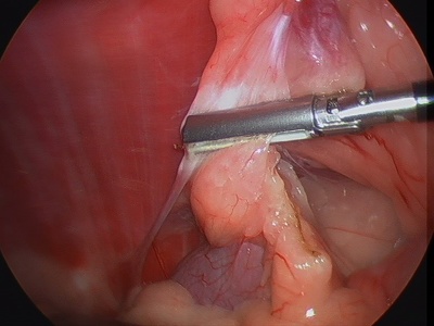 シーリングシステムを使って、卵巣の血管をシールしながら切断しています。