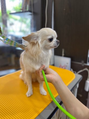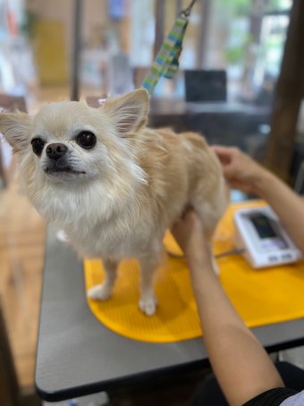 トリミングの合間に計測♪ トリミングの一部になってる?? とっても落ち着いてさせてくれるチーちゃんです(*^▽^*) 先月と比べてどうかなぁ?