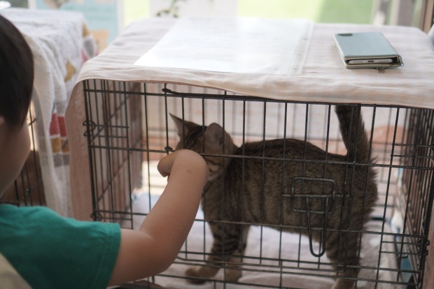 小さな男の子がゲージ越しに手を置くとスリスリと子猫が「撫でて~」と行ったり来たり♡