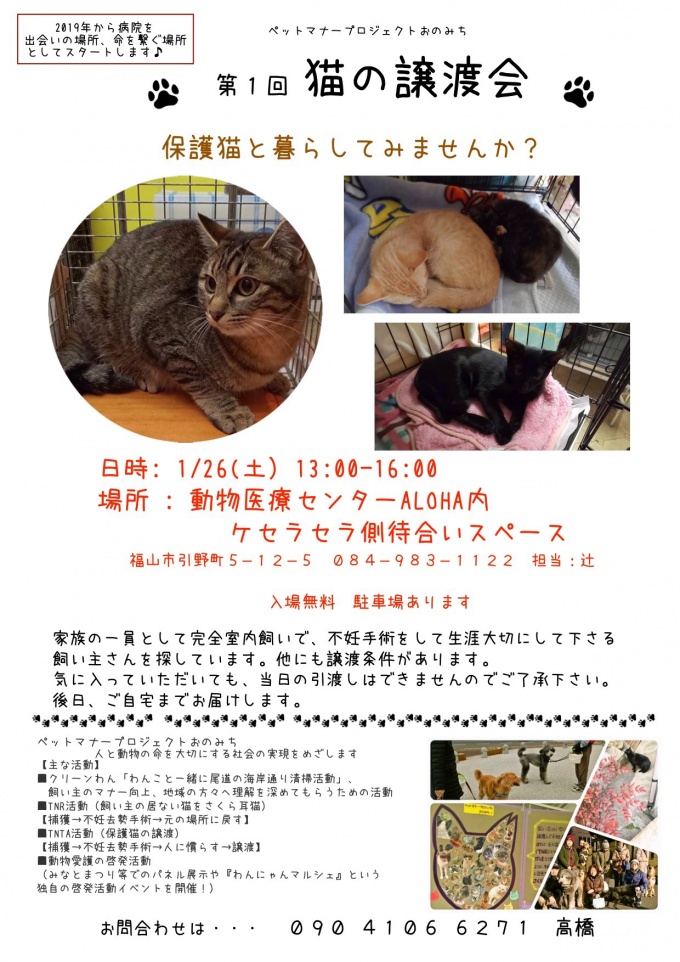 やっとその思いを形にすることができそうです。ペットマナープロジェクトおのみちさんの協力で、2019年1月からねこの譲渡会を病院で定期的に開催します。