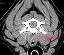 横の画像が正常の頸椎のCT画像です。下の写真に比べてもらうと、脊髄神経がはっきり見えるのがよく分かると思います。