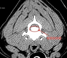 CTの検査をおこなうと、頸椎の第2ー3番の間に重度の椎間板の脱出があり、頚椎椎間板ヘルニアと診断しました。