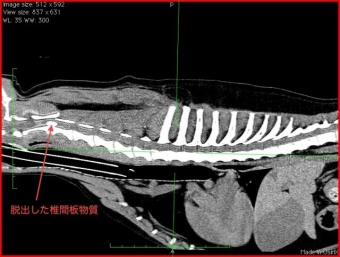次に、横の画像がリリーちゃんの圧迫を受けている頸椎のCT画像です。上の写真に比べると、下側から、大量の椎間板物質に圧迫されているのがよくわかりますよね。