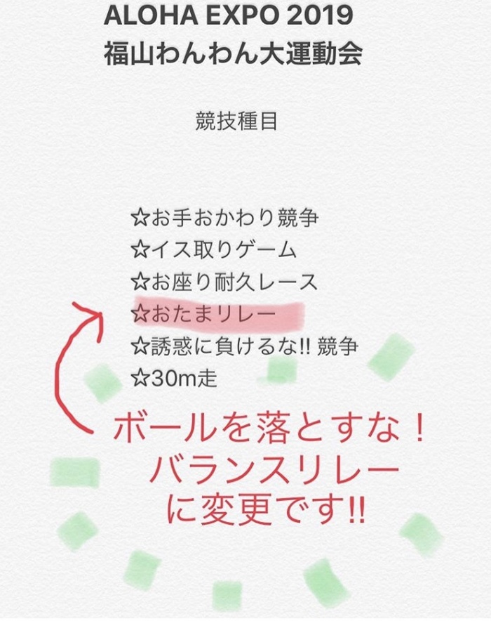 ※おたまリレーが「ボールを落とすな!バランスリレー」に変更になりました。(2019/10/14改) 競技種目はこのようなラインナップで楽しんで頂きたいと思います! エントリーは当日の受付でお願いします。 どんな競技なのかはまたどんどん動画を更新していきますので、ぜひ練習をして挑戦してみてくださいね~(^^)