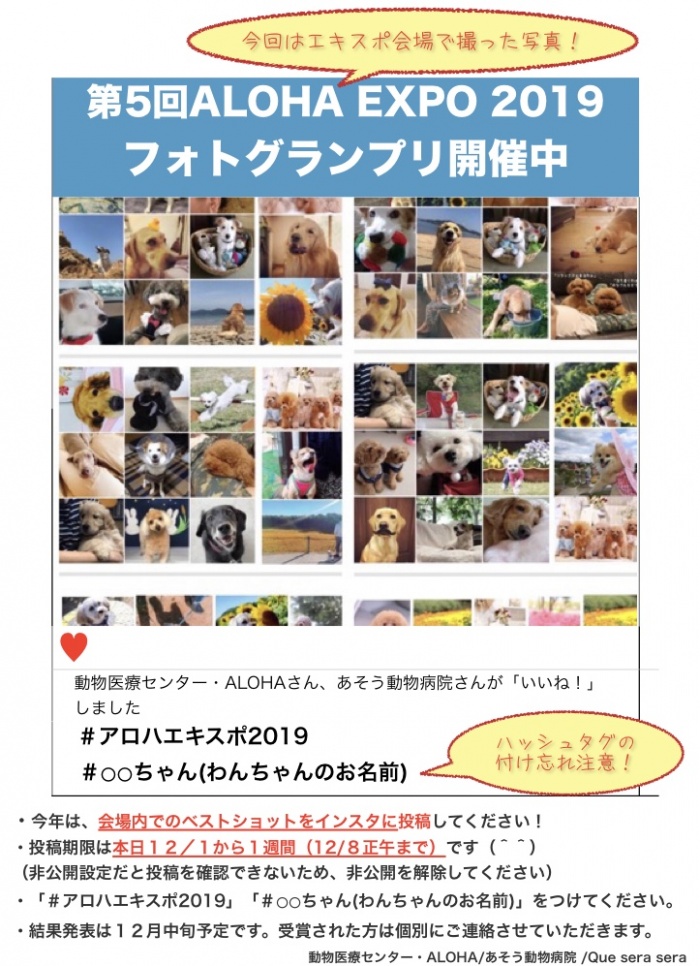 インスタフォトグランプリを開催します!! 今回は12/1当日に撮影した写真のみ! 当日会場内で撮影したベストショットをインスタに投稿してください! 投稿期限は12/1から1週間(12/8正午まで)!! 「#アロハエキスポ2019」「#〇〇ちゃん(わんちゃんのお名前)」のハッシュタグは必ずつけてくださいね(*^_^*) 結果発表は12月中旬の予定です! みなさんどしどし送ってくださいね! (非公開設定を公開に解除してから投稿するようにしてください)