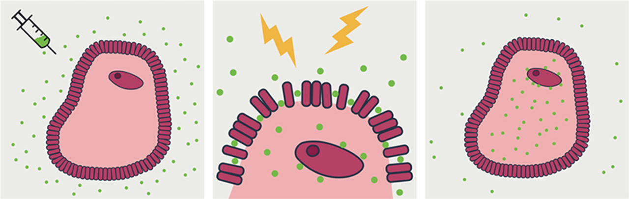 電気パルスによってがん細胞の膜が一時的に変化し、抗がん剤が腫瘍細胞の中へ入りやすくなることで、薬の効果を引き出します。